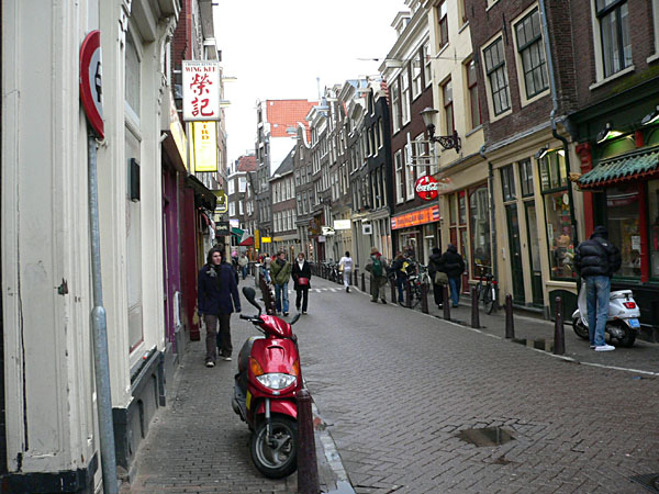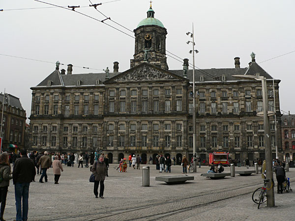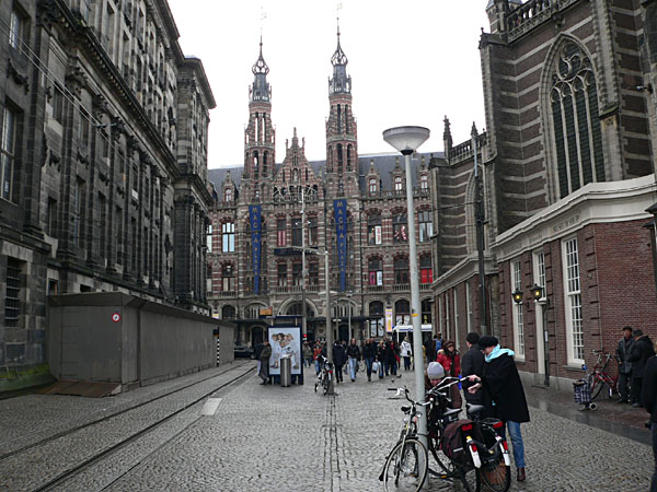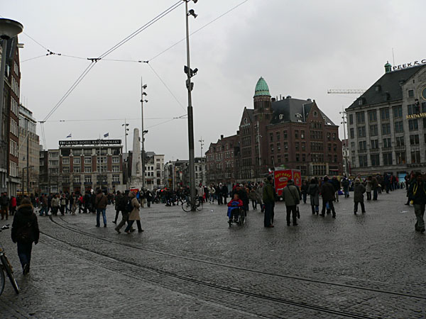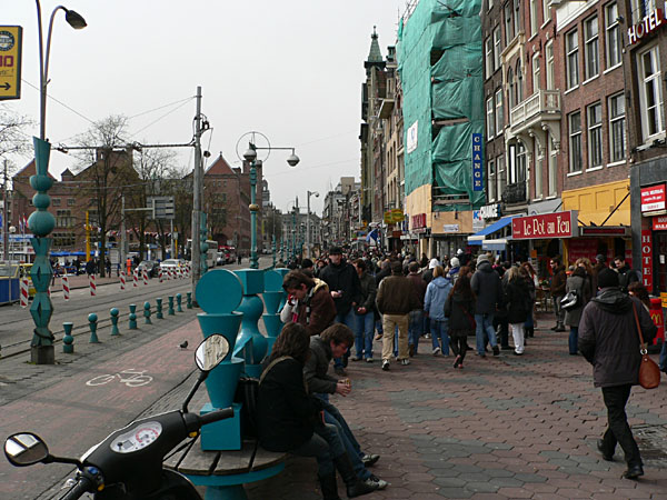 In jedem Falle führt der Weg zuerst den Damrak hinunter, eine der üblichen bahnhofsnahen Einkaufsstraßen, wobei hier die Spielhöllen, Tand-Läden, billigen Hotels und Wechselstuben das Bild beherrschen. Warum sich solcher Müll an Läden immer gerade am Bahnhof ansammelt, habe ich bisher auch nicht verstanden. Sinnigerweise liegt in dieser Straße aber auch die Amsterdamer Börse, die Beurs van Berlage, ein klassizistischer Riesenbau. Es ist Ostersonntag, aber die Straße sind so gut gefüllt wie bei uns an den Advents-Samstagen. Geht man den Damrak herunter, gelangt man in das freundlichere und angenehmere Amsterdam, nämlich auf den Platz vor der Nieuwe Kerk und dem Königlichen Palais, den Dam. Hier finden sich nun auch Madame Tussaud, die Effekten-Börse und die großen Kaufhäuser.