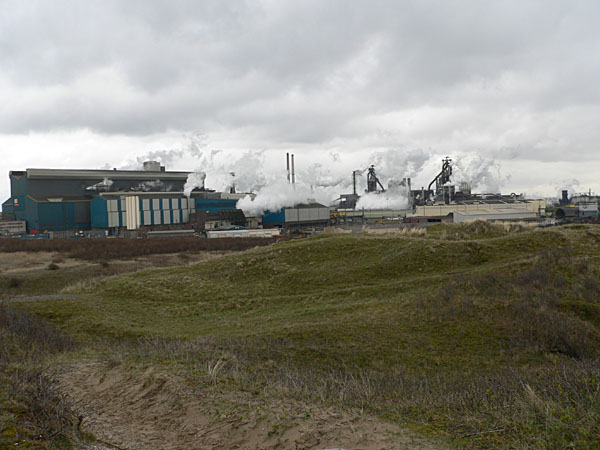 Schaut man nun aus dem Hotelfenster, sieht man zuerst die großen Dünen, und dahinter riesige Stahl- und Chemiewerke. Dieser Bereich, in dem die Ij vom Atlantik in das Inland bis nach Amsterdam und weiter reicht, ist eines der wenigen großen Industriegebiete der Niederlande. Und so sieht man hier Hochöfen, Schornsteine und Industriehallen en masse. Was nun nicht das Gefühl eines echten See-Urlaubes vermittelt. Vereinfacht: es ist ziemlich hässlich hier. Also Vorhänge zu und ignorieren.