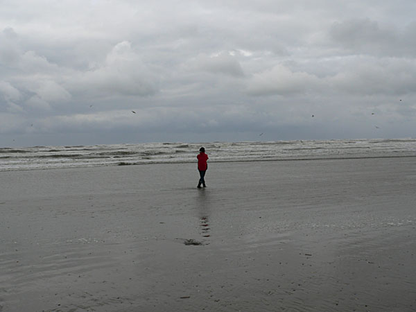 Nach den erlittenen Erfrierungen in Amsterdam scheint sich das Wetter erst zu bessern, es scheint sogar etwas die Sonne, über dem Meer jedoch braut sich dunkel und drohend etwas zusammen. Bleibt es draußen oder kommt es rein, dieses Wetter?