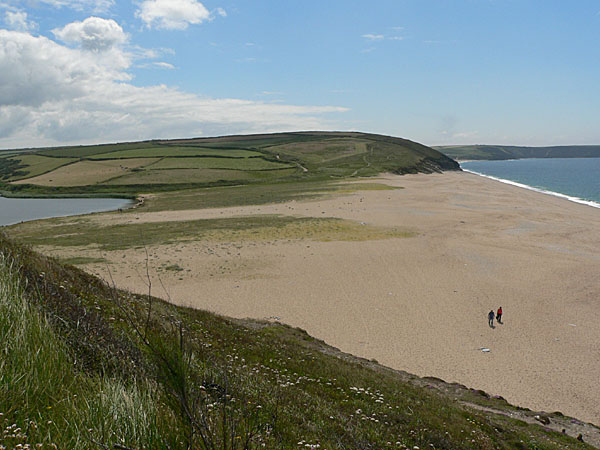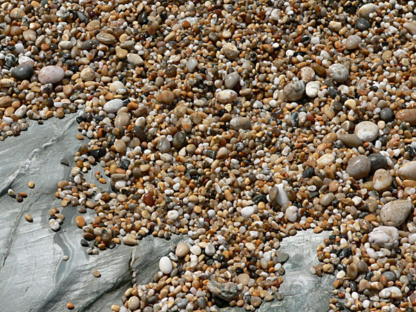 Erst einmal Richtung Helston, abbiegen nach Porthleven, man fährt aber nicht auf der Hauptstraße bis in den Ort durch, sondern biegt kurz vor Porthleven in Penrose Hill nach links ab. Dort liegt in kleiner NT-Parkplatz, Penrose Car Park (sehr einsam, keine Wertsachen im Auto lassen). Von dort aus geht ein kleiner Fußweg in ein Waldgebiet, kurz später kommt man in eine parkähnliche Anlage, vermutlich der ehemalige Park des Anwesens Penrose. Auf teils asphaltierten, teils geschotterten Wegen könnte man nun ganz um den Loe Pool herum gehen. Dieser See entstand, als eine Sanddüne, Loe Bar, eine Bucht vom Meer abtrennte und sich dieser See bildete. Es geht auf der westlichen Seite des Sees entlang Richtung Loe Bar, wo man wieder auf den Strand trifft. Und eben diese Düne mit Namen Loe Bar. Zum Baden eignet sich dieser Strand nicht besonders, der Meeresboden fällt sehr steil ab und es bilden sich gefährliche Unterstömungen. Aber interessant ist, wie sich an diesem Strand das Gestein sortiert: von fast feinem Sand über alle Zwischenstufen bis zu größeren Kieseln.