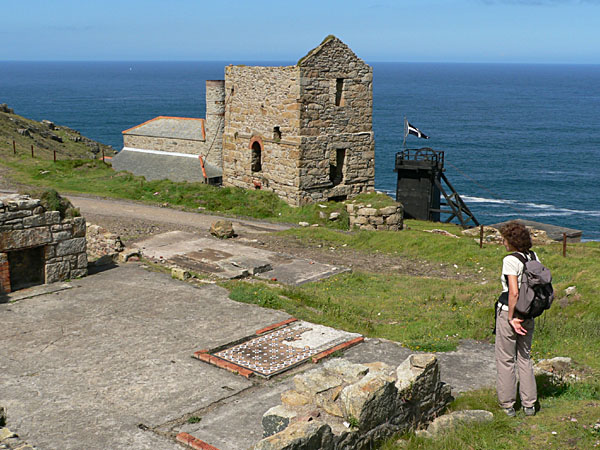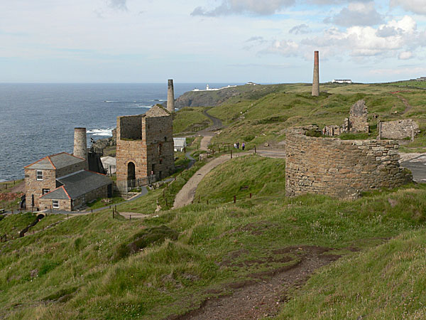 Etwas unterhalb der Calartha Farm, dem derzeitigen Domizil, vor dem Leuchtturn, verläuft wieder der Coastal Path. Also dort Richtung Südwesten, ausgeschildert ist Cape Cornwall, 3.5 Meilen, was auch immer dieses Cape sein mag. Zwar waren schon gestern abend im Neben die einsamen Reste einer alten Zinn-Mine zu sehen. Was man ja schon so toll fand. Was nun nach ca. 1.5 Meilen aber kam, war dann völlig überraschend. Hier stößt man auf die jüngeren Teile der Levant Mining Area, ein größeres Gebiet, wo bis in das 20. Jahrhundert hinein Zinn und Kupfer gewonnen wurden. Diese Anlage ist beeindruckend, der Coastal Path führt direkt hindurch. Oberhalb von Levant Mine liegt Geevor Mine, eine weitere Anlage, die erst 1991 außer Betrieb ging, heute Museum einschließlich Untertage-Tour. Aber zurück zur Levant Mine. Diese bestand aus einer ganzen Reihe von einzelnen Schächten, wobei zu jedem Schacht mindestens ein Beam House oder Engine House gehörte, in dem die Maschinen zur Förderung des Erzes standen. Zuerst Holz und Kohle, später auch Gas oder Öl zum Betrieb der Motoren, Pumpwerke und anderer Antriebe. Dies waren eben die Häuser mit den Kaminen. An anderen Stellen standen die Anlagen zur Aufbereitung des Erzes und zur Verhüttung. Übrigens wurde nur Zinn hier gewonnen, Kupfererz ging nach Wales, wo es genug Kohle für die Verhüttung gab. Auch die Kohle für den Betrieb der Dampfmaschinen kam aus Wales, landete weiter östlich in einem der Häfen an, wurde dann in Körben auf bis zu 200 aneinander gebundene Pferde verladen und über den Coastal Path hierher gebracht. Auf dem Weg zurück in den Hafen wurden dann die Körbe mit Kupfer-Erz beladen, das zur Verhüttung zurück nach Wales ging. Da Cornwall keine Kohlevorkommen hat und die Kupfergewinnung viel Kohle erfordert, wurde somit nur Zinn direkt vor Ort gewonnen.