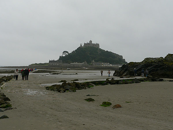 Regen, Nebel, Wind ohne Ende, so beginnt die Abreise in Coverack. Letzte Sachen in’s Auto und Richtung Penwith an der Südküste kurz vor dem Ende der britischen Hauptinsel. Die Insel ist hier nicht mehr so besonders breit. Um den Tag hinter sich zu bringen, empfiehlt sich eigentlich Einkaufen und Mittagessen in Penzance, der lokalen Großstadt in dieser Ecke; da aber kurz vor dem Passieren von Marazion der Regen mal aufhört, und der Tag eh lang genug ist, fährt man besser die wenigen Meilen herunter zu St. Michael’s Mount, der Burg auf der Insel. Einfach nur mal schauen.