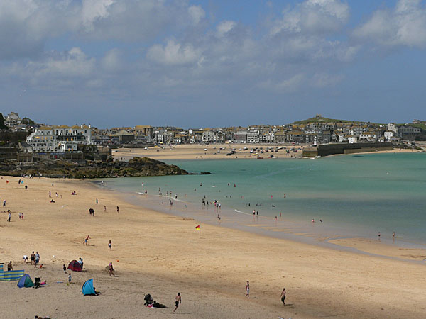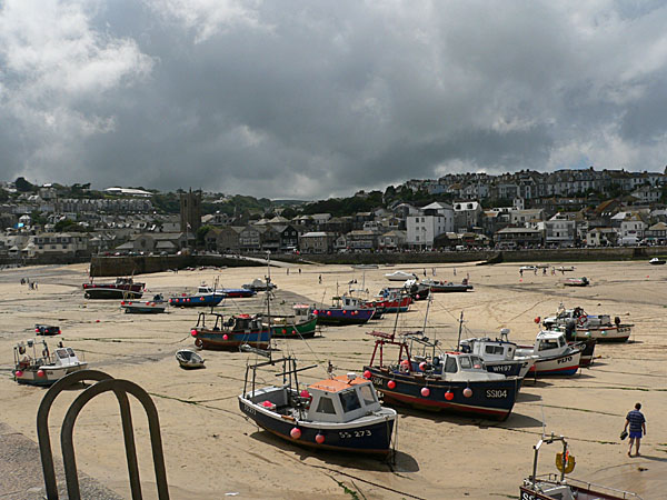 Über der See blauer Himmel, über dem Land dicke weiße Wolken. Aber nicht kalt. Also auf und von Pendeen zehn Meilen gen Osten nach St. Ives, angeblich einer der 25 Plätze in Cornwall, die man nicht verpassen darf. Der Rough Guide ist da weniger euphorisch (was ich an ihm schätze), aber machen wir uns selbst ein Bild.