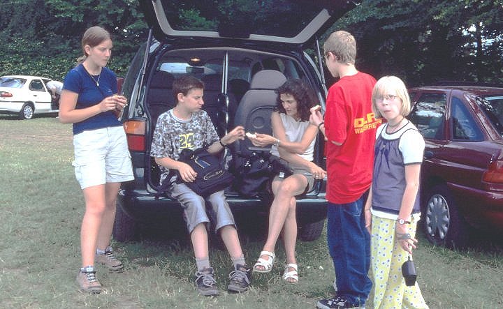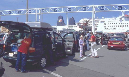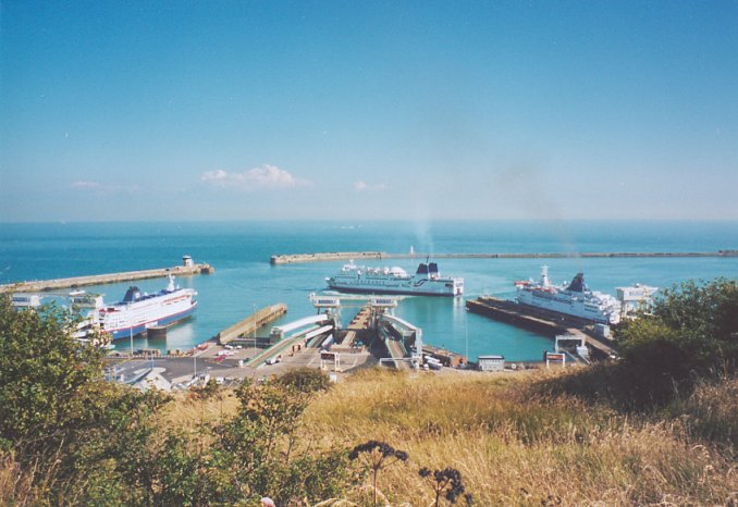 Die unerwarteten Staus zwischen Paderborn und Calais aufzuzählen wäre müßig (der erste kam aber schon nach der nächsten Autobahn-Abfahrt in Geseke). Die Folge war, dass wir unsere Fähre um 14:15h nicht mehr erwischten, jedoch dann die nächste um 15:15h ab Calais. Handy und Aferry.to sei Dank. Es ist eine Frage, ob man nicht den schnelleren Tunnel vorzieht, die Reise per Fähre bietet aber 90 Minuten Ruhe und Pause, die Fähre war nicht sehr gebucht, das Wetter war toll und die Erwartung (meinerseits), die White Cliffs von Dover wieder zu sehen, spricht aus meiner Sicht immer für die Fähre. Die Fähren von Calais und Oostende fahren übrigens nicht mehr im Takt wie vor dem Tunnelbau. Oostende hat den Vorteil von einer Stunde weniger Autofahrt und den schnelleren Seacats. Calais passte vom Fahrplan aber besser. Another day another sausage (Nachtrag 2004: der Fährverkehr von Oostende ist eingestellt).