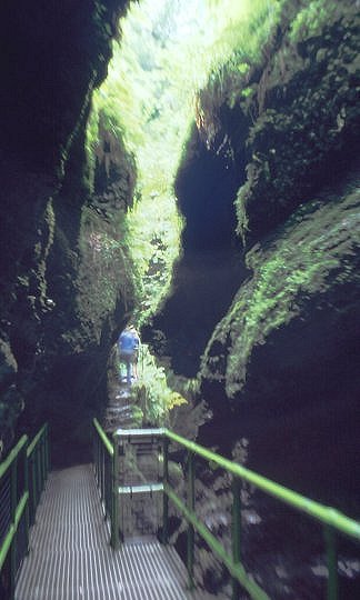 Lydford Gorge: ein Rundweg führt durch tiefgrünen, satten Wald und dann in dieSchlucht und Klamm. Der Wasserfall markiert den Beginn der Schlucht, wenig später verengt sich die Schlucht zu einer Klamm, die Wege sind extrem schmal undsteinig, teils in den Fels gehauen. Festes Schuhwerk empfiehlt sich, dafür kommt man in eine tolle Umgebung, wo sich derFluss einen tiefen Graben geschaffen hat, bestückt mit Strudeln und Whirlpools natürlicher Herkunft. Die Klamm ended im Devil’sCauldron, nur durch eine steile Treppe und über eine Stahlplattform zu erreichen. Obwohl oben die Sonne scheint, im Devil’s Cauldron ist es düster, feucht und laut. Am Ende dann noch ein Kaffee und ein Stück Kuchen im Cafe des NT. | ![]() |