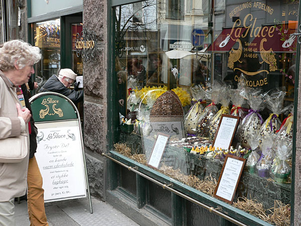 Noch ein Abendrundgang heute? Na klar, aber diesmal in die entgegengesetzte Richtung, nach Frederiksberg, wo man am Abend noch in einem Schaufenster zuschauen kann, wie die Schokoladen-Ostereier per Hand gemacht werden. Dann weiter zum Schloß, der Park schließt leider bald schon, in Richtung Geschäftsviertel und zurück nach Kopenhagen. Auch dies ist wieder eine lange Runde.