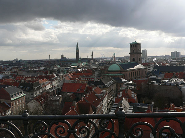 Diese Tour führt so quasi um den Innenstadtkern herum und endet an einem Rundturm an der Trinitatis Kirke. Kostet 30DKR Eintritt, führt aber innen auf einem gepflasterten Pfad in siebeneinhalb Rundungen ohne Treppenstufen über die Dächer von Kopenhagen. Nur ein paar Stufen braucht es auf das Dach.