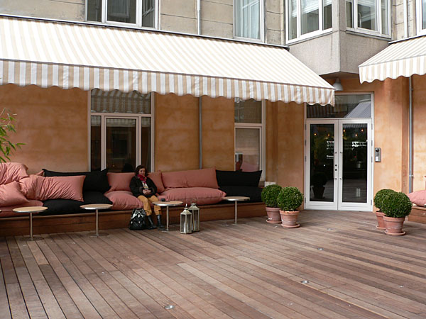 Die Terasse muss im Sommer sehr gemütlich sein, sie liegt zum Hof. Wirklich ein nettes Hotel. Mit dem Fahrrad sind es nur Minuten bis in’s Zentrum, die Hauptstrasse vor dem Hotel führt geradeaus in die Stadt. Aber auch rundherum um das Hotel gibt es eine dichte Infrastruktur, schon dies macht das Hotel empfehlenswert, die Preise gehen für Kopenhagen auch in Ordnung.