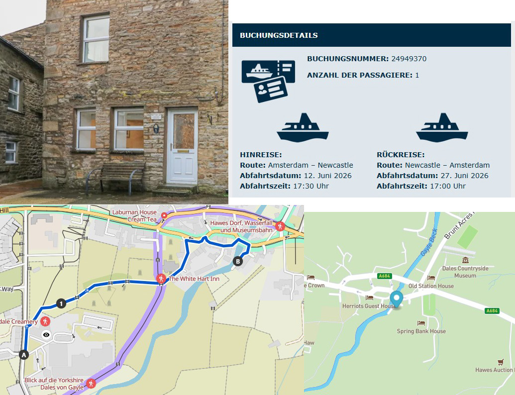 Im September Zeit für neue Pläne in 2026. Die Fährpläne bei DFDS waren gerade erst veröffentlicht worden, damit hatten wir einen sicheren Platz in einer Hundekabine. Die Suche nach einem Cottage gestaltete sich jedoch schon im September schwieriger, außer den ganz teuren Locations fast alles ausgebucht. Dann doch eine nicht so kuschelige Gelegenheit, sozusagen mittig in Hawes, aber Wensleydale. Deutlich teurer als unsere bisherigen Cottages, dafür um die Ecke das erste Pub, mittig im Ort und eher günstig gelegen für eine Morgenrunde mit Besuch des Cafés in der Wensleydale Creamery. Nun noch sieben Monate warten und wir starten wieder neu. Mit passendem T-Shirt. Und Pin für die Jacke.