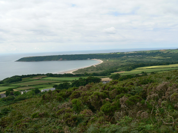 Der Anstieg auf Rhossili Down ist nicht unanstrengend, wo nun auch noch die Sonne heraus kommt und angenehme Wärme verbreitet. Die Sicht von diesem Hügel ist immer wieder grandios, auf Worm’s Head und Hillend, auf die hinter uns liegenden Felder und den langen Strand von Rhossili. Leider bezieht es sich nun wieder.